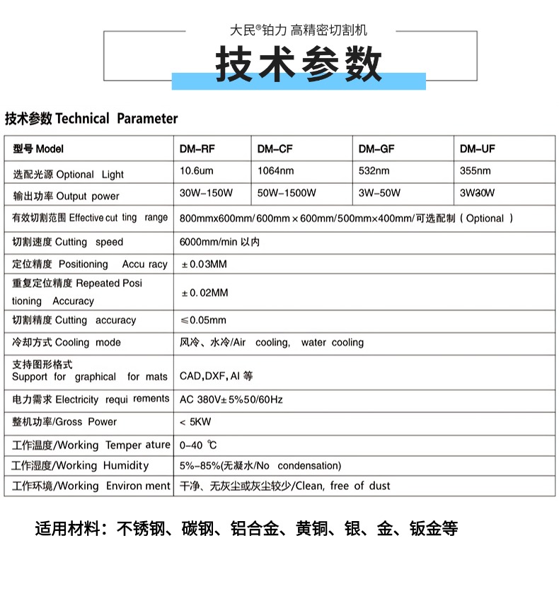 大民® 铂力 高精密激光切割机 技术参数表 :