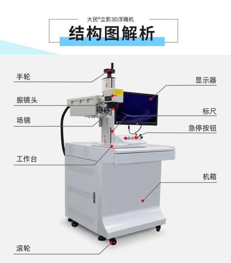 大民®立影 3D激光打标机是颠覆传统二维加工方式的划时代智能装备。它通过智能3D动态聚焦与精密轴控技术,使激光束能实时精准聚焦于复杂曲面的每一点,实现不规则物体表面的高精度、可控深度的立体浮雕加工。无论是斜面、弧面还是异型结构,它都能将精细图案、文字乃至人像完美复刻于其上,为您开启三维实体精细加工的无限可能。