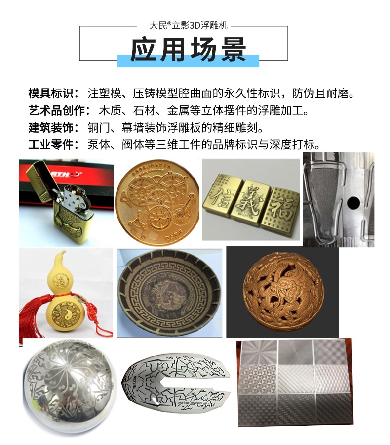 驾驭曲面,雕琢维度 —— 大民®立影3D激光打标机从平面到曲面,让创意在任何维度自由生长。实现复杂物体表面±0.1mm精度下的深度雕刻与艺术创作。大民®立影 3D激光打标机是颠覆传统二维加工方式的划时代智能装备。它通过智能3D动态聚焦与精密轴控技术,使激光束能实时精准聚焦于复杂曲面的每一点,实现不规则物体表面的高精度、可控深度的立体浮雕加工。无论是斜面、弧面还是异型结构,它都能将精细图案、文字乃至人像完美复刻于其上,为您开启三维实体精细加工的无限可能。