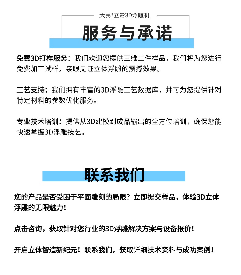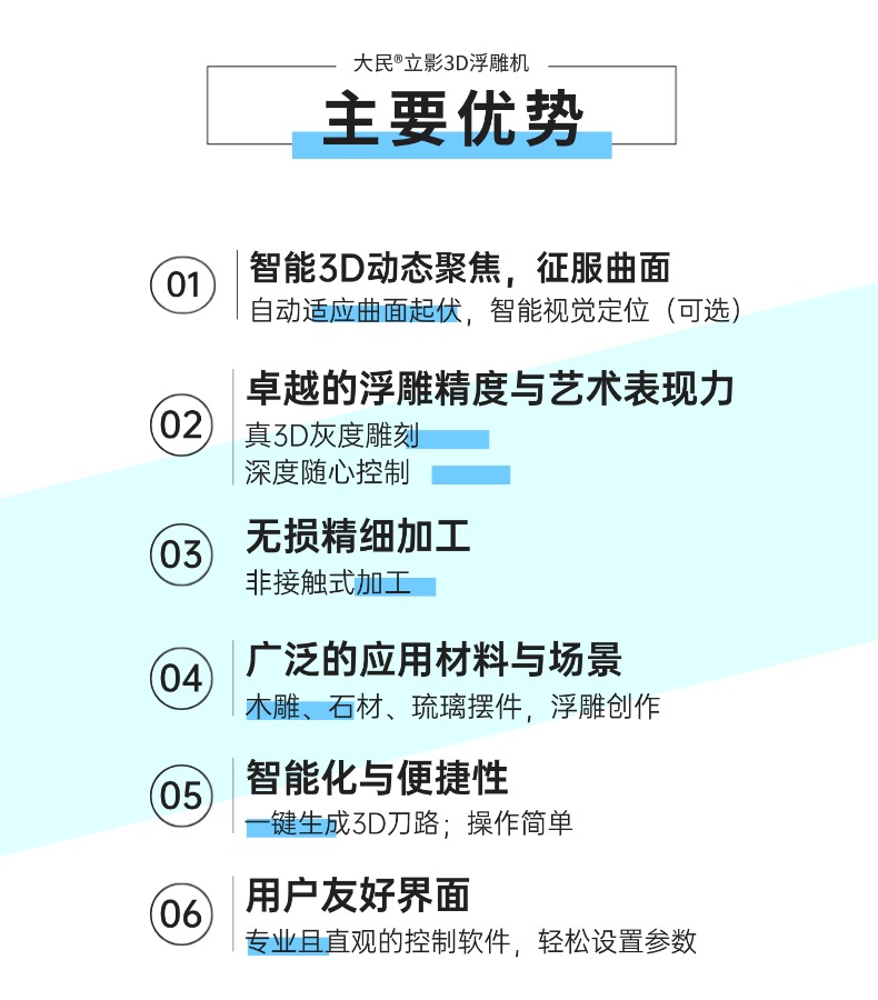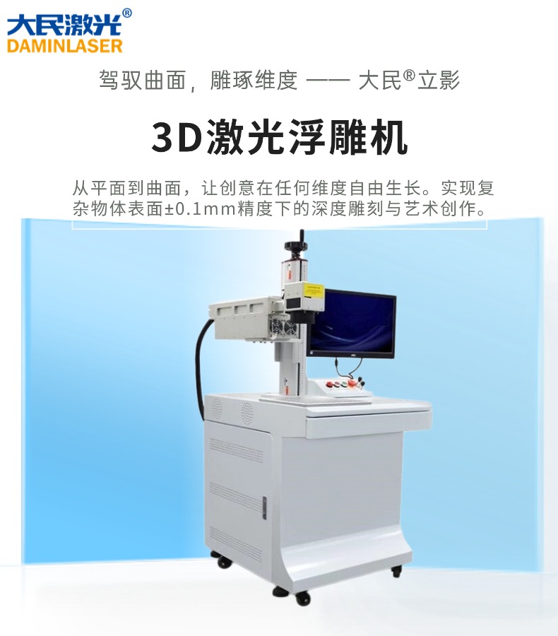 征服曲面,标刻无限 ——大民®立影 3D激光浮雕机,无需平整,无视野角。在任意三维曲面实现±0.05mm精度的完美打标。大民®立影 3D激光浮雕机是专为攻克复杂曲面打标难题而生的高端智能装备。它突破了传统激光设备只能处理平坦表面的局限,通过智能3D动态聚焦系统,让激光束能实时精准聚焦于工件高低起伏的每一个点。无论是斜面、弧面、台阶面还是异型曲面,它都能实现无畸变、全清晰、高对比度的永久性标识,彻底解决因焦距变化导致的标记模糊、断裂等行业痛点。